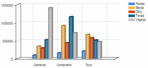 The following example displays a bar chart in 3D Mode and as Cylinders.