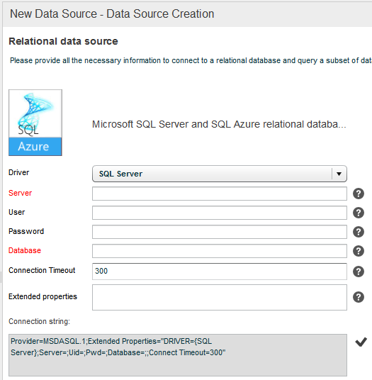 Provide all the necessary information to connect to a relational database query a subset of data. Note that mandatory entries are indicated in red.