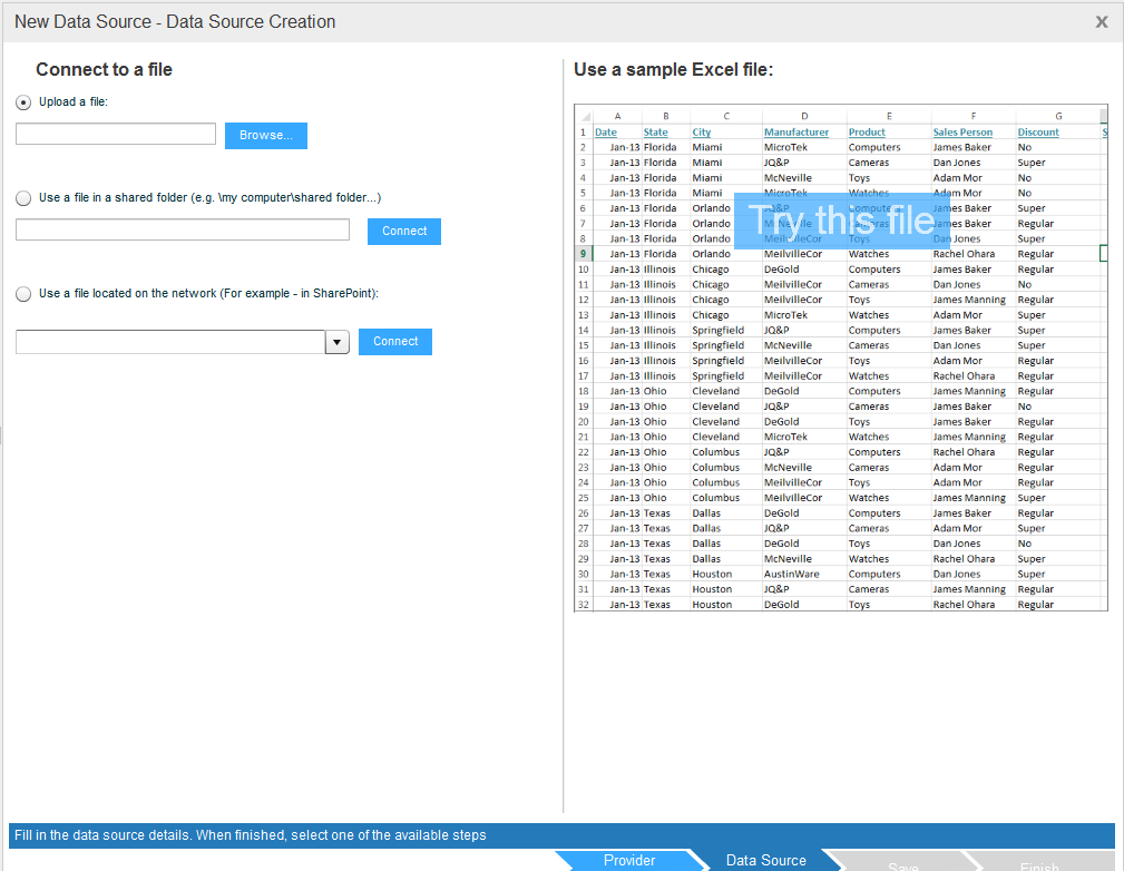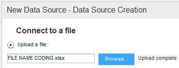 When you select the Excel or CSV File option you can create a data source from an Excel file or a comma-separated (.csv) text file.