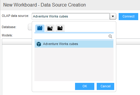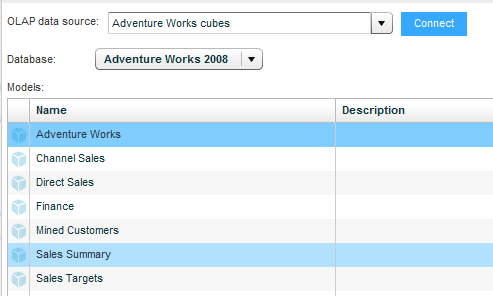 1. In the OLAP Data Source dropdown, choose an OLAP data source and click OK. Click Connect.