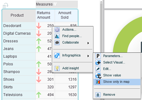 After selecting the infographics in the grid, select the Show Only in Map option from each relevant column/row or cell menu.