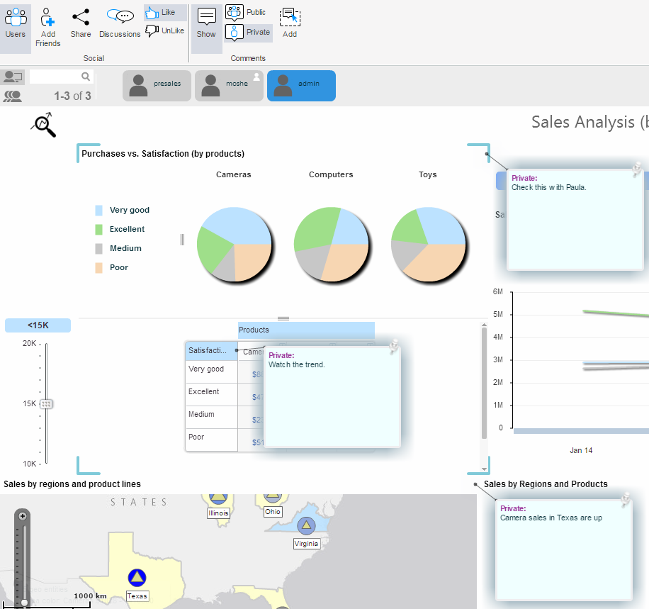The Show button on the Social tab of the ribbon shows all the comments added to the current workboard. In Private Mode, it displays only your private comments. In Public Mode, it shows all the comments added to the workboard by other workboard users.