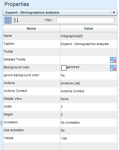 To display the properties of any item, click the arrow at the top of the pane and choose that item. Also, clicking on an entity in the Infographics entity pane, or on a graphic item in the design area, displays the relevant properties.