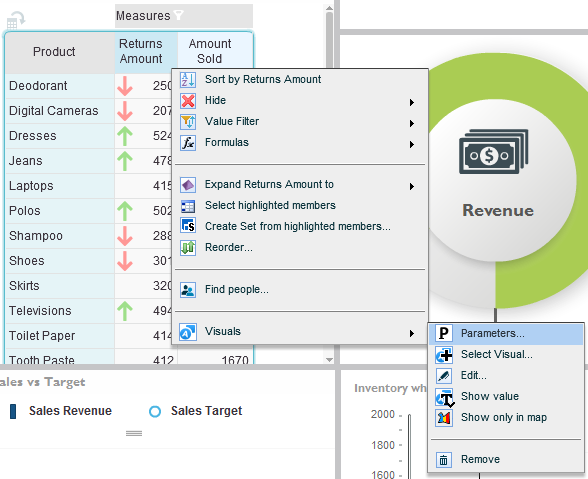 To open the relevant parameters, click Parameters on the Visuals tab of the ribbon, or select Infographics > Parameters from a specific column/row menu or a cell menu.