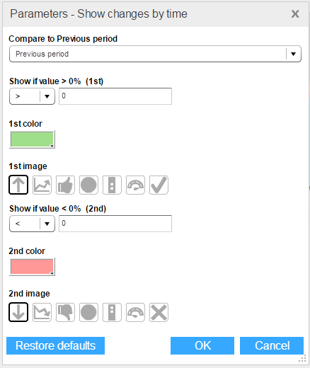 An infographics entity may have parameters defined for adjusting the visuals: setting conditions and thresholds, changing colors and images, rotating images, and more.