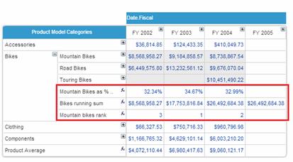In the following example, three customized formulas have been defined to analyze Mountain Bikes in relation to the Bikes product category.