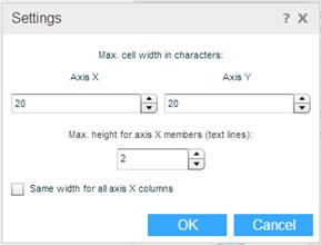 In the Settings dialog box, you can change the cell width for the X- and Y-axes in terms of number of characters. Necto performs automatic alignment according to the number of characters. If a value is longer than the maximum number of characters, word-wrapping will occur.
