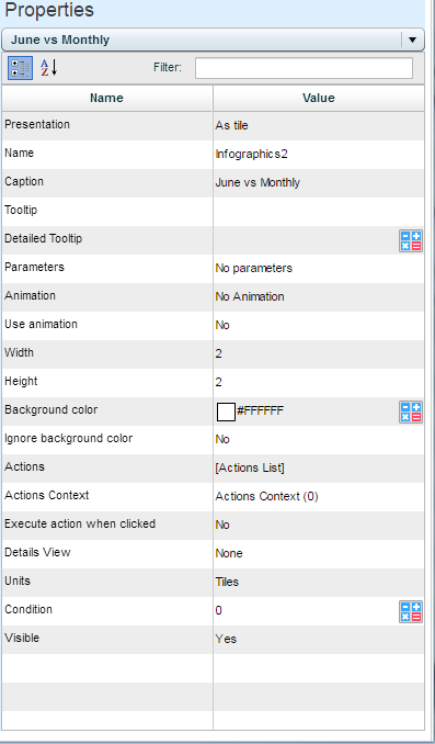 The infographics entity properties contain definitions that apply at the entity level: the entity’s caption, the tooltip displayed to the end-user, the background color, the animation style, the actions that can be executed from an entity, and more.