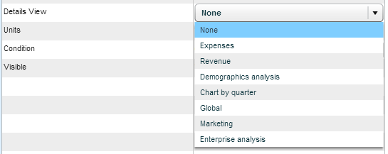 This property enables you to connect the entity to another entity in the infographics family. The Details button appears on the entity’s toolbar in the infographics component and the end-user can click it to display the connected entity.