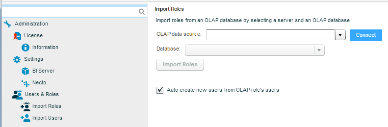 4. Select the Auto Create New Users from OLAP Role’s Users check box in order to automatically create user records in Necto for the users assigned to the imported OLAP roles.