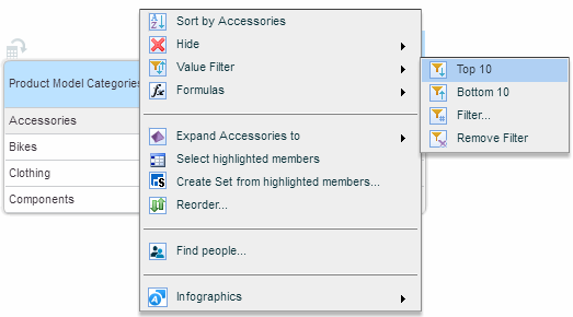 in the member heading, and from the member menu select Value Filter > Top 10 or Bottom 10.
