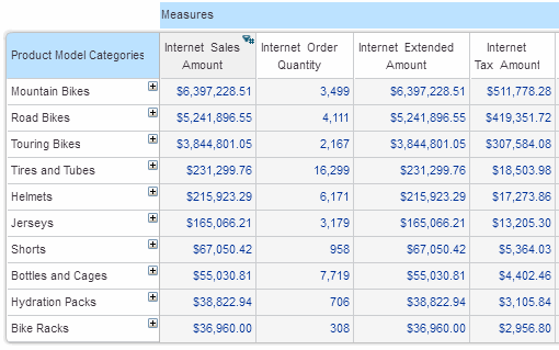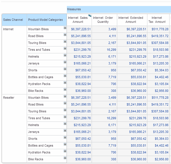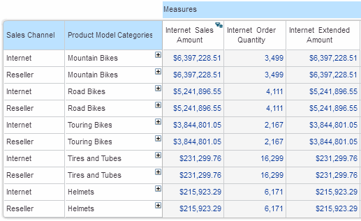 In the following example, Product Model Categories is nested after Sales Channel and both dimensions are in flat layout. The example illustrates how Top-10 ranking has been performed for the entire grid when there are nested dimensions. To achieve this all nested dimensions must be in Flat layout.