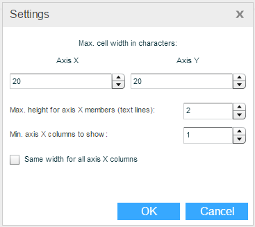 You can change the cell width for the X- and Y-axes in terms of number of characters. Necto performs automatic alignment according to the number of characters. If a value is longer than the maximum number of characters, word-wrapping will occur.