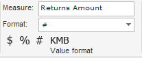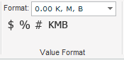 Select a format from the dropdown list in Format, or click on one of the formats: $ for currency format, % for percentages, # for integer format, and KMB for K (thousand), M (million) B (billion) format.