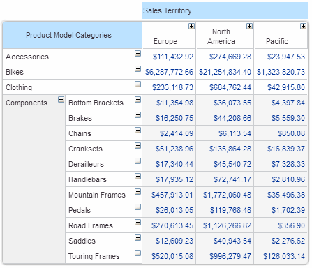 In the following example, the Product Model Categories dimension is presented in standard layout. The Components member is drilled down but no totals are shown for it.
